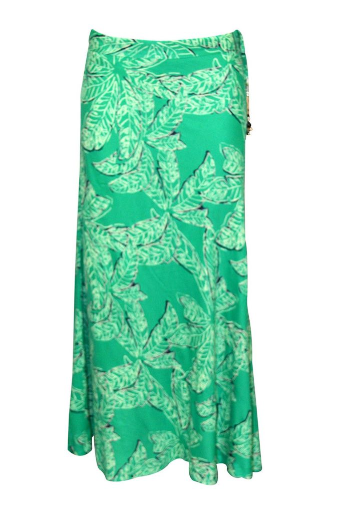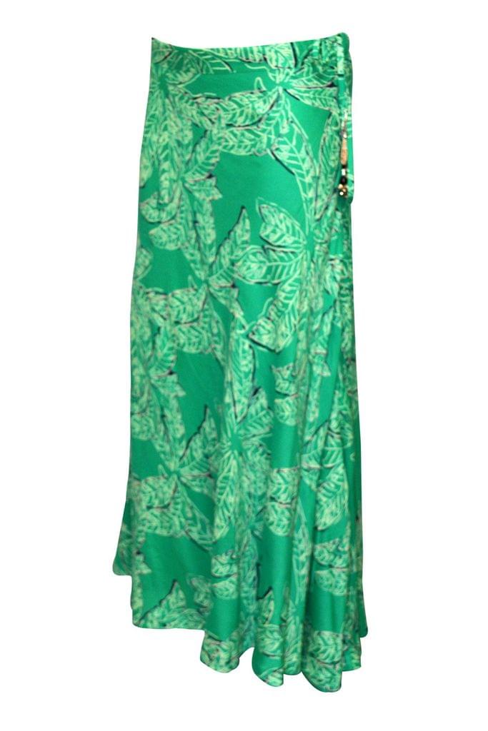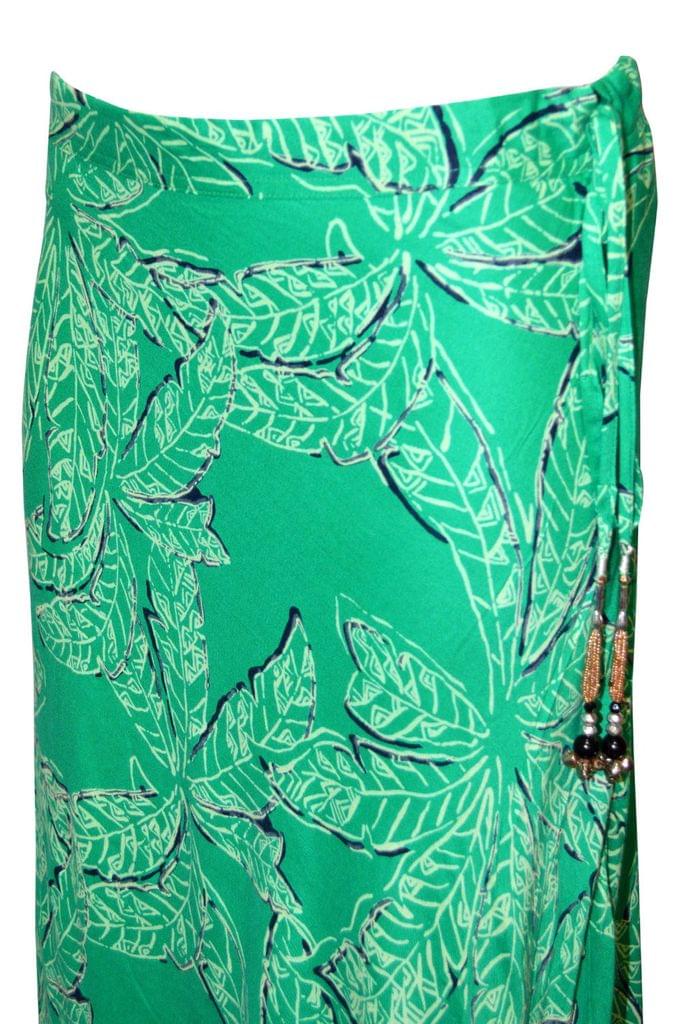 Summer cool leaf print diva skirt with beaded tassels, has a waistband with drawstring closure, side zipper closure, and flared hem. Has a soft matching inner voile (mulmul) lining.