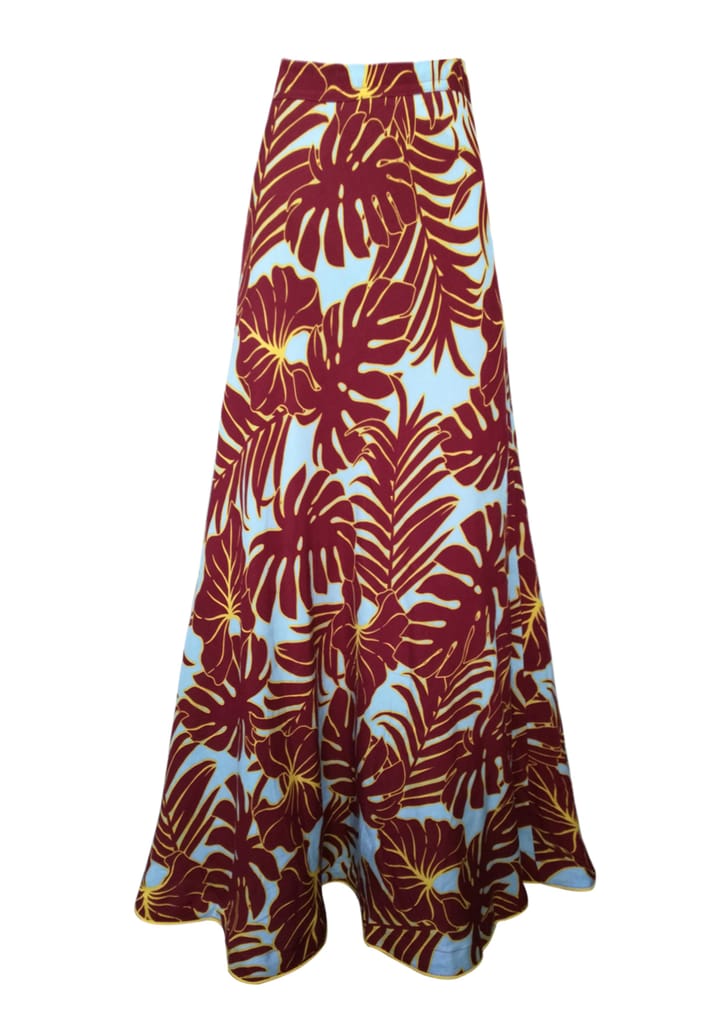 Maroon leaf printed skirt, has a waistband with drawstring closure, side zipper closure, and flared hem.