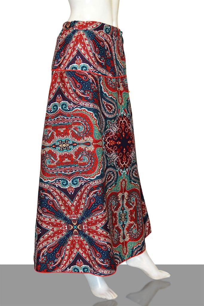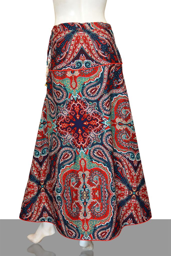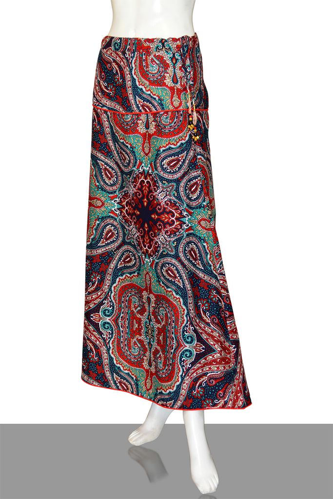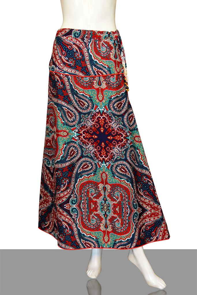 Bright Paisley printed diva skirt in deep maroon base with beaded tassels, has a waistband with a yoke at the hip contrast piping and drawstring closure, side zipper closure, and flared hem with a matching contrast piping at the edge. Has a soft matching inner voile (mulmul) lining.