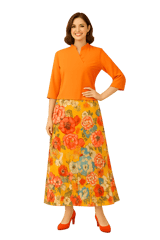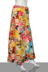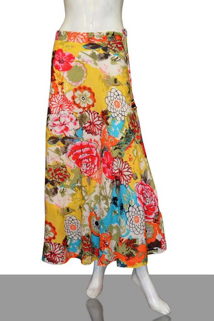 A lovely multicolored floral yellow and orange base printed diva skirt with beaded tassels, has a waistband with drawstring closure, side zipper closure, and flared hem. Has a soft matching inner voile (mulmul) lining.