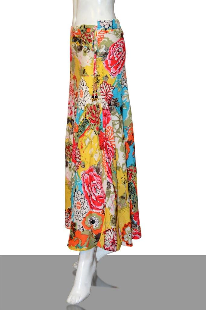 SKU-VHTGRSK52QA lovely multicolored floral yellow and orange base printed diva skirt with beaded tassels, has a waistband with drawstring closure, side zipper closure, and flared hem. Has a soft matching inner voile (mulmul) lining.